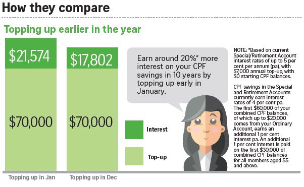 You stand to earn around 20 per cent more interest on your CPF savings in 10 years by topping up in January. For example, by topping up $70,000 in January, the interest amounts to $21,574 after 10 years, which works out to be 20 per cent higher than the $17,802 interest generated over the same period for topping up $70,000 in December.
