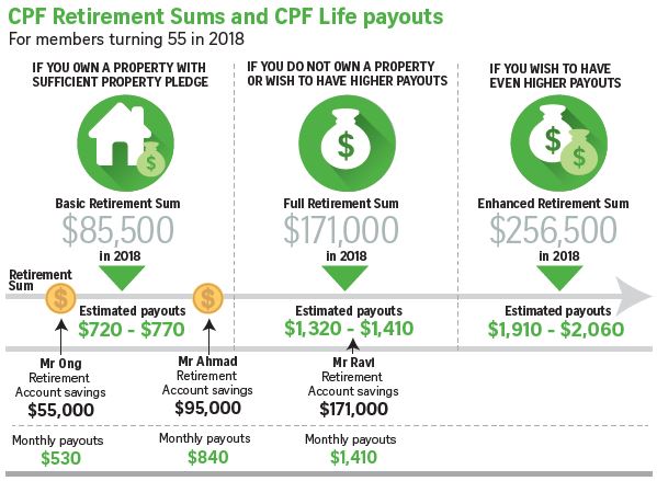 Help your parents decide how much money to set aside in their RAs so they can receive their desired monthly payouts. There are three Retirement Sums - Basic ($85,500), Full ($171,000) and Enhanced ($256,500).