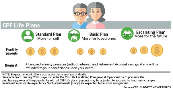 Under CPF Life, there are three plans to choose from - Standard, Basic and Escalating. In a nutshell, the Standard plan offers a higher monthly payout but a lower bequest, while the Basic plan has lower payout and higher bequest.