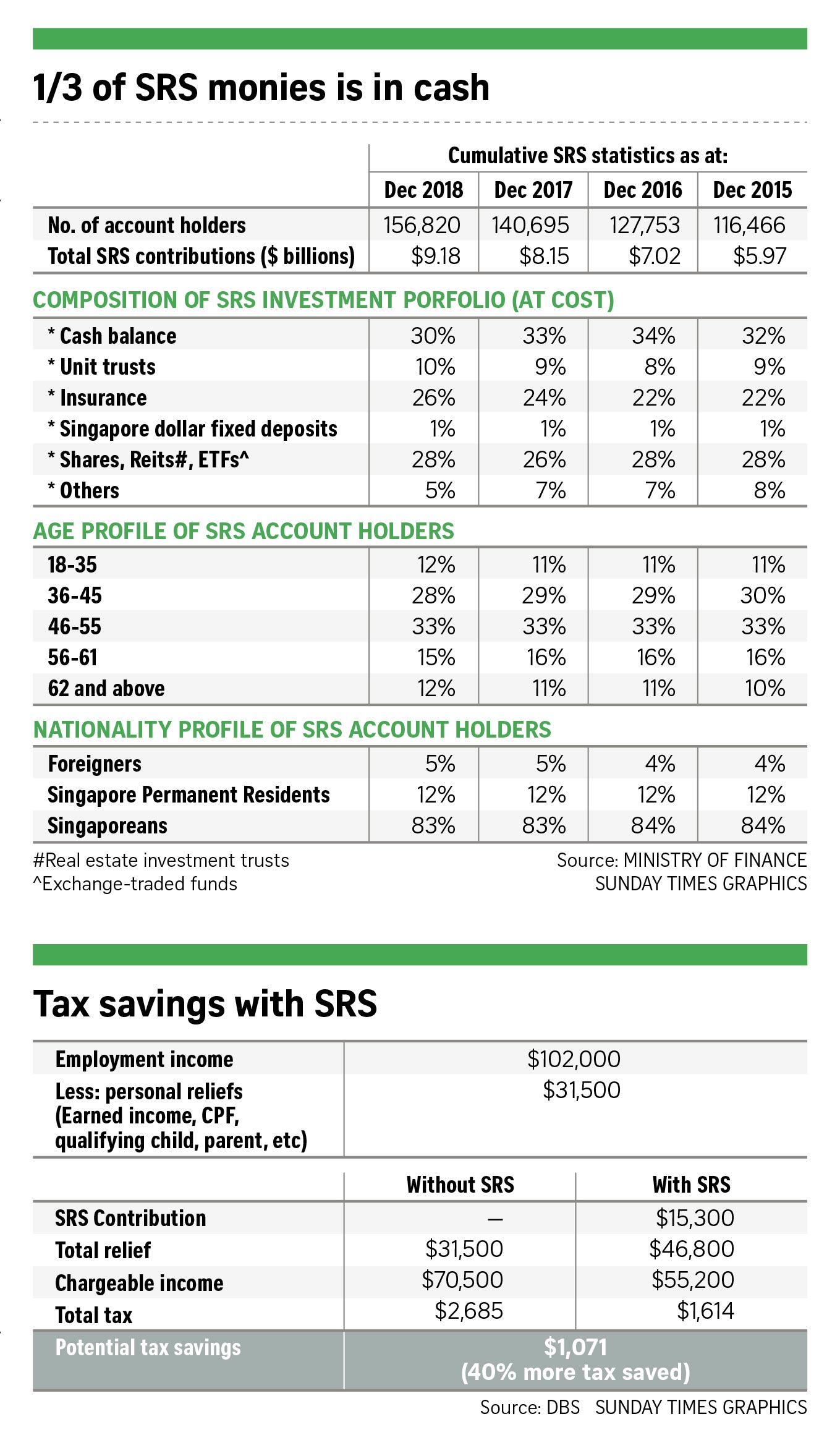For example, if you are a Singaporean and eligible to claim reliefs of up to $70,000, you may wish to contribute only $10,000 to the SRS, rather than the maximum amount of $15,300, as there will be no tax relief available for the additional $5,300. You should consider putting the extra funds into other long-term investment vehicles, as the tax relief at contribution for SRS is no longer available and it would be more beneficial to invest in funds that provide tax-free returns as capital gains are not taxed here, Mr Selvam said.