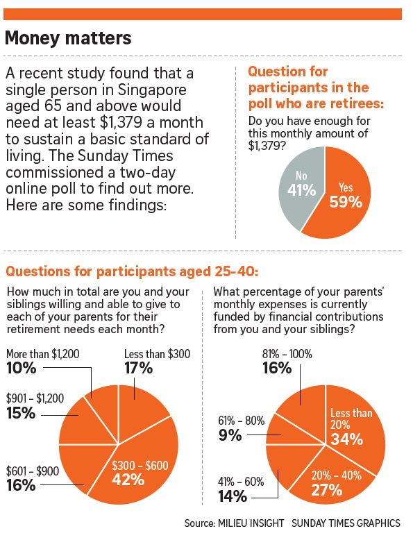 And 52 per cent of the group with less than $1,379 say they expect help from their children while 55 per cent are looking to government assistance or charities. The online poll was commissioned by The Sunday Times and carried out last week by consumer research firm Milieu Insight.