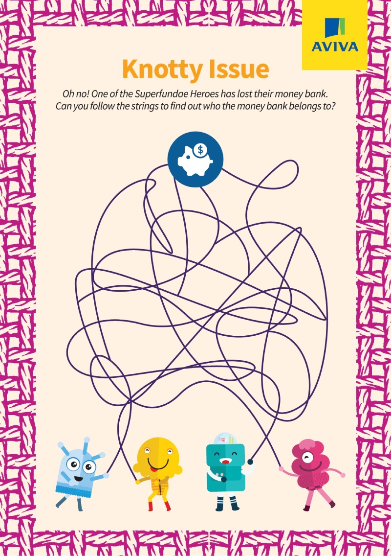 Oh no! One of the Superfundae heroes has lost their money bank. Follow the strings to find out who the money bank belongs to.